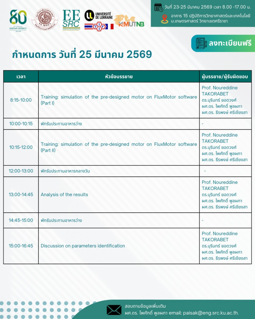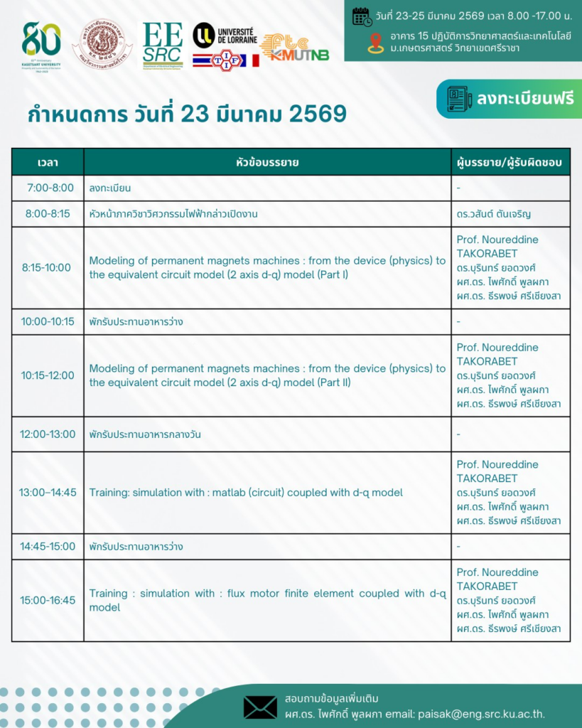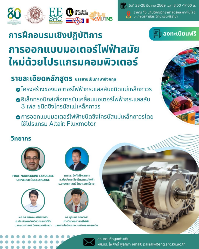 ภาควิชาวิศวกรรมไฟฟ้า มหาวิทยาลัยเกษตรศาสตร์ วิทยาเขตศรีราชา จัดโครงการอบรมหัวข้อ การออกแบบมอเตอร์ไฟฟ้าสมัยใหม่ด้วยโปรแกรมคอมพิวเตอร์ ระหว่างวันที่ 23–25 มีนาคม 2569