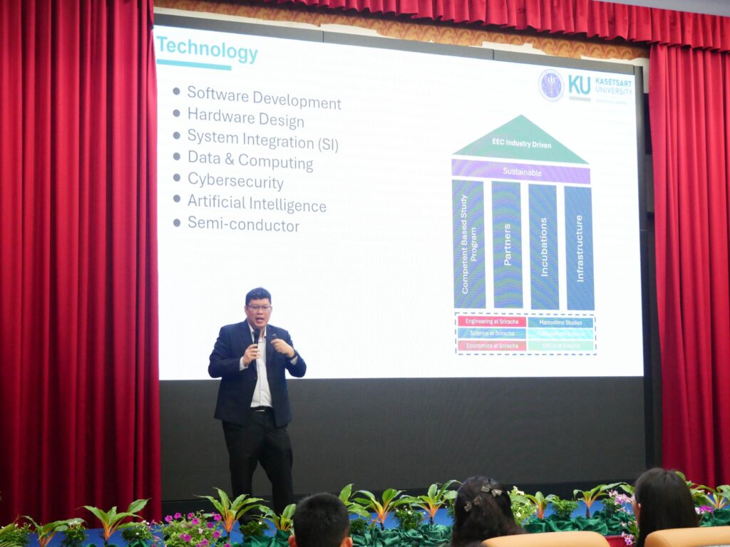 ในโอกาสนี้ คณะผู้เข้าร่วมยังได้ฟังการบรรยายหัวข้อ “บทบาทของสถาบันอุดมศึกษาในการพัฒนาทรัพยากรมนุษย์เพื่อรองรับอุตสาหกรรม New S-Curve ด้านดิจิทัล” โดย รองศาสตราจารย์ ดร.ณัฐพล จันทร์พาณิชย์ คณบดีคณะวิศวกรรมศาสตร์ ศรีราชา