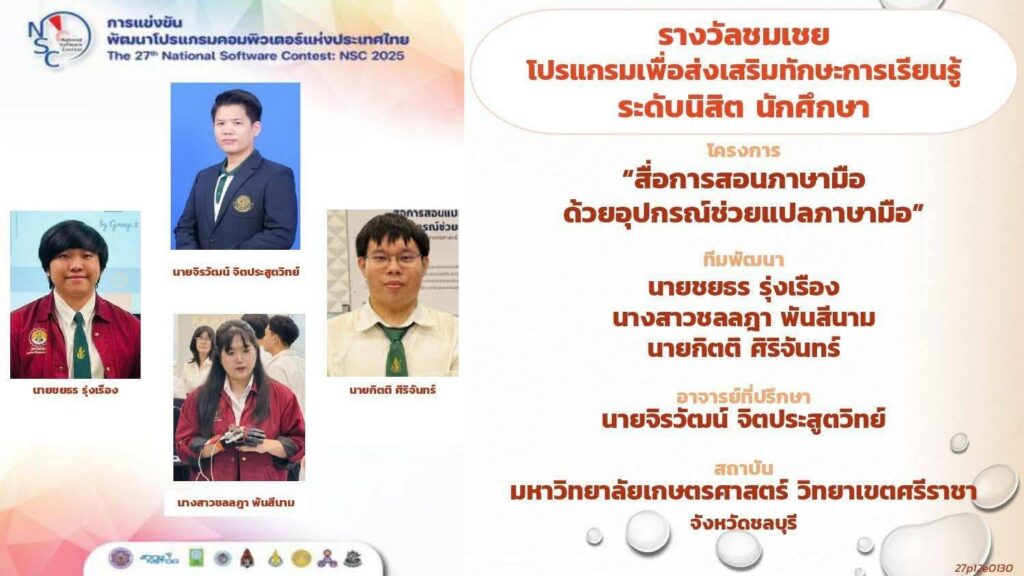 ภาควิชาวิศวกรรมคอมพิวเตอร์ คว้ารางวัลชมเชย พร้อมทุนสนับสนุนผลงาน ระดับอุดมศึกษาสำหรับการพัฒนาโปรแกรมคอมพิวเตอร์แห่งประเทศไทย ครั้งที่ 27 (The 27th National Software Contest 2025) ภายใต้หัวข้อโปรแกรมเพื่อส่งเสริมทักษะการเรียนรู้ ระดับนิสิต นักศึกษา