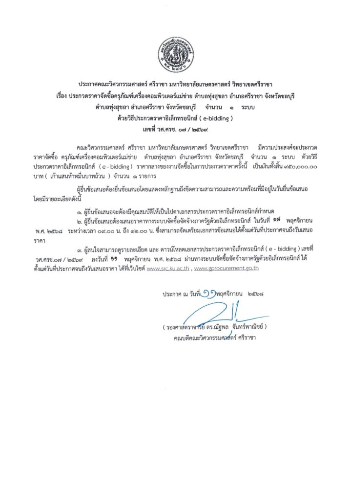 คณะวิศวกรรมศาสตร์ ศรีราชา ประกวดราคาจัดซื้อครุภัณฑ์เครื่องคอมพิวเตอร์แม่ข่าย ตำบลทุ่งสุขลา อำเภอศรีราชา จังหวัดชลบุรี จำนวน 1 ระบบ